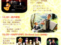 2026年1月25日(日) 開演14:00 開場13:30 会場:サウンドステーション in 豊南市場(阪急宝塚線庄内駅東口すぐ豊南市場内) 観覧料:500円 14:00~ 〈タンゴ・グレリオ〉バンドネオン・星野俊路 ギター・米阪隆広 14:40~ 〈歌声喫茶〉アコーディオン・米村博実、絵本朗読・石浜繁子、歌唱・萩森秀太 15:20~ 〈HAPPYPIPE Dixiland jazz BAND〉クラリネット・草野友善、バンジョー・かねだたつこ、ピアノ・草野和美、チューバ・片岡耕、ボーカル・アンディ 主催: ...